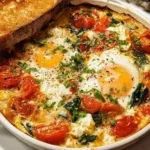 A quick and nourishing breakfast dish featuring baked eggs nestled among creamy feta, bursting cherry tomatoes, and fresh spinach.