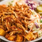 The Shredded BBQ Chicken can be homemade or store-bought; either way the sauce is the backbone of the bowl. For the potatoes I use a little Olive oil, Salt, Pepper, and Paprika to help them caramelize and develop those crispy edges I love. For the coleslaw I keep the dressing simple with Mayonnaise and Apple cider vinegar so it complements rather than competes with the BBQ flavors. Dill pickles bring that sharp, briny lift that cuts through richness.