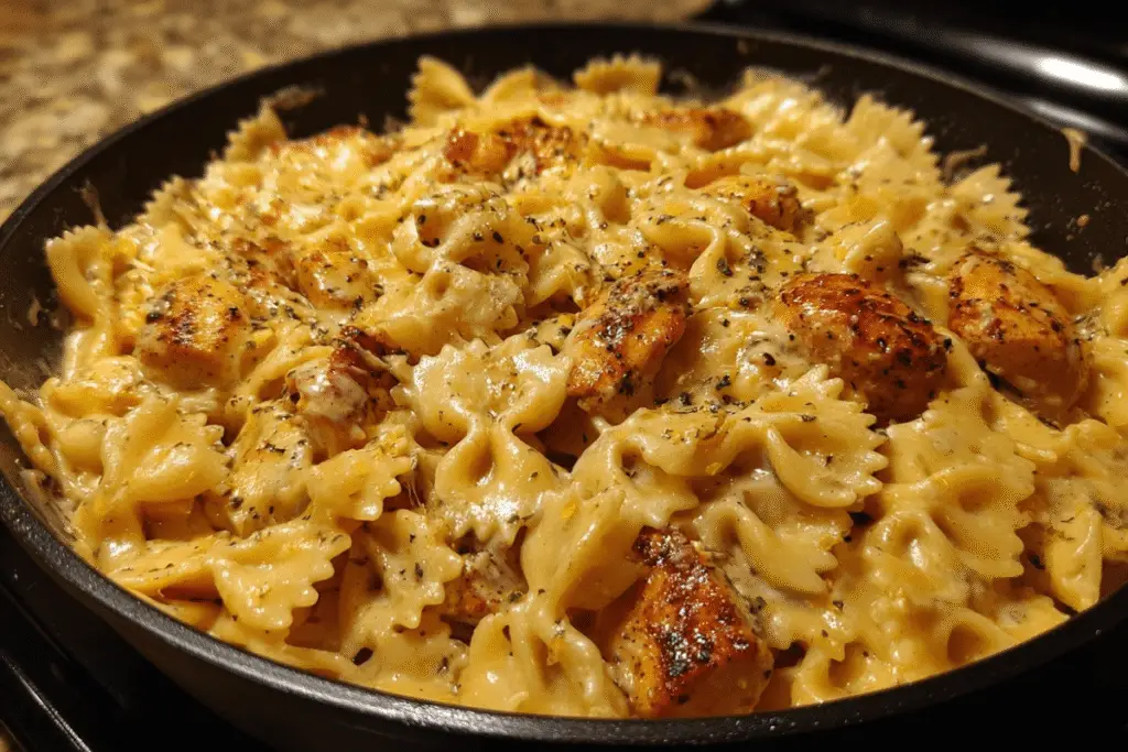 - Return the cooked chicken to the skillet and toss it in the sauce. Stir in the cooked bowtie pasta and mix until everything is evenly coated. Let it simmer for about 2–3 minutes.