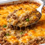 A comforting casserole featuring ground beef, creamy mushroom soup, fluffy rice, and melted cheddar cheese, perfect for family dinners.