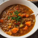 A warm, comforting, and nutritious soup made with tender lentils, vibrant vegetables, and a touch of lemon for brightness.