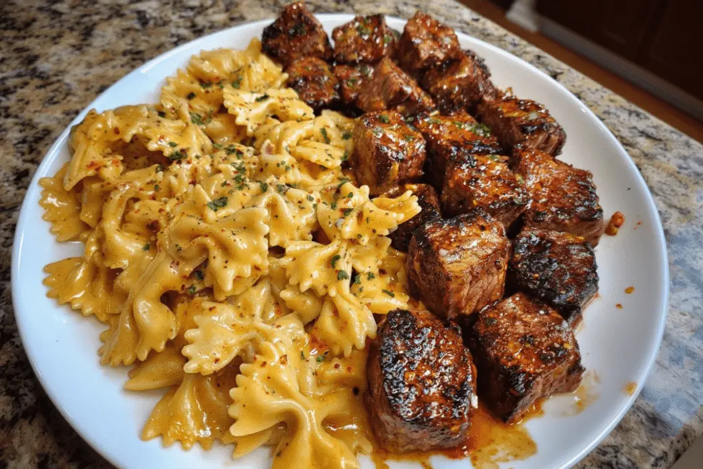 Garlic Butter Steak Bites with Cheesy Bowtie Pasta in Cheddar Sauce