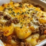 A comforting casserole with tender potatoes, savory ground beef, and a creamy mushroom sauce topped with melted cheese, making it a perfect family meal.