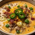 This bowl of Keto Cheeseburger Soup is one of those dinners that wraps you in warmth and makes the whole household feel a little sheltered from the rush of the day. Every spoonful carries browned-beef savor, creamy cheddar comfort, and the gentle bite of cauliflower that keeps it light in spirit. I love that it is both practical and indulgent, suitable for a rushed weeknight and gentle enough for a slow weekend meal. Keep the toppings simple and bright, and serve it in bowls that make people want to linger. If you give it a try, taste and tweak it to your family’s preferences. That small act of tailoring is what turns a recipe into a tradition. Enjoy the cozy bowl and the slow smiles that follow.